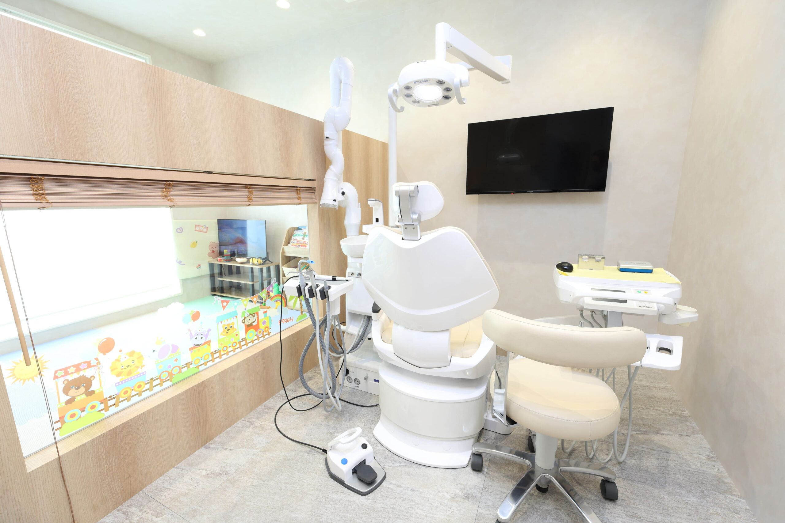 当院では、小さなお子さまも楽しく通院できるようなキッズスペースを設けています。お子さまが遊んでいる間も、保護者の方が安心して治療を受けられるよう、遊ぶお子さまを見守りながら治療できるユニットを完備しています。