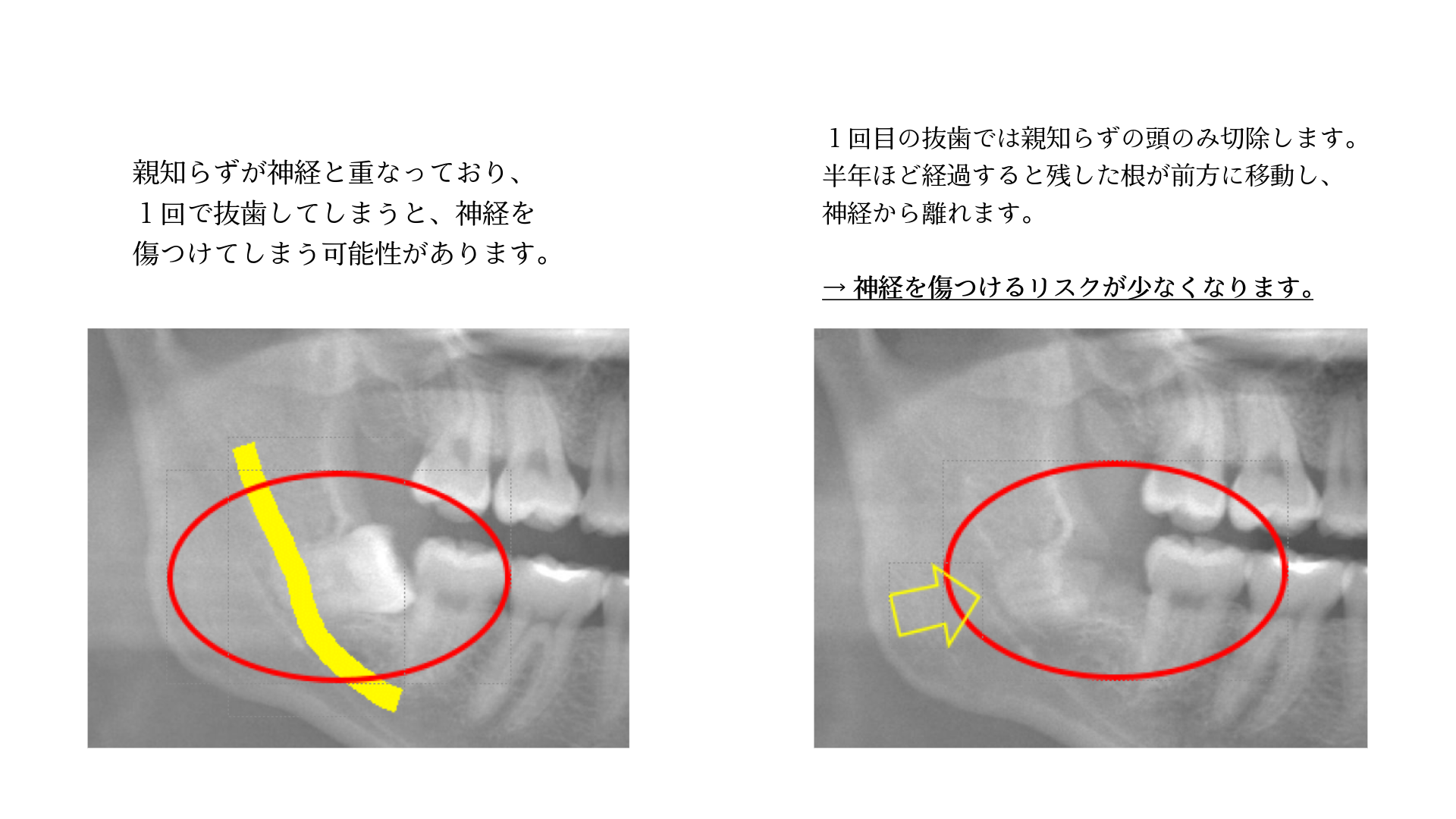 歯ぐきの中に残った根が、時間とともに少しずつ前方へ移動し、神経から距離が離れていきます。→ そのため、神経損傷によるしびれのリスクを大幅に軽減できます。
