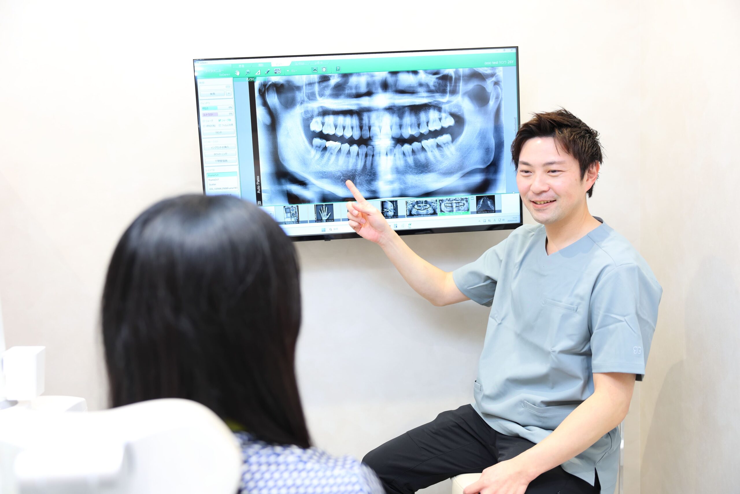 また、検査結果をもとに、患者さまのお口の状態や治療方針について丁寧にご説明し、治療に対するご不安やご希望もしっかりお伺いします。被せ物の種類についても、ご要望に合わせて保険診療・自由診療の選択肢をご案内しています。