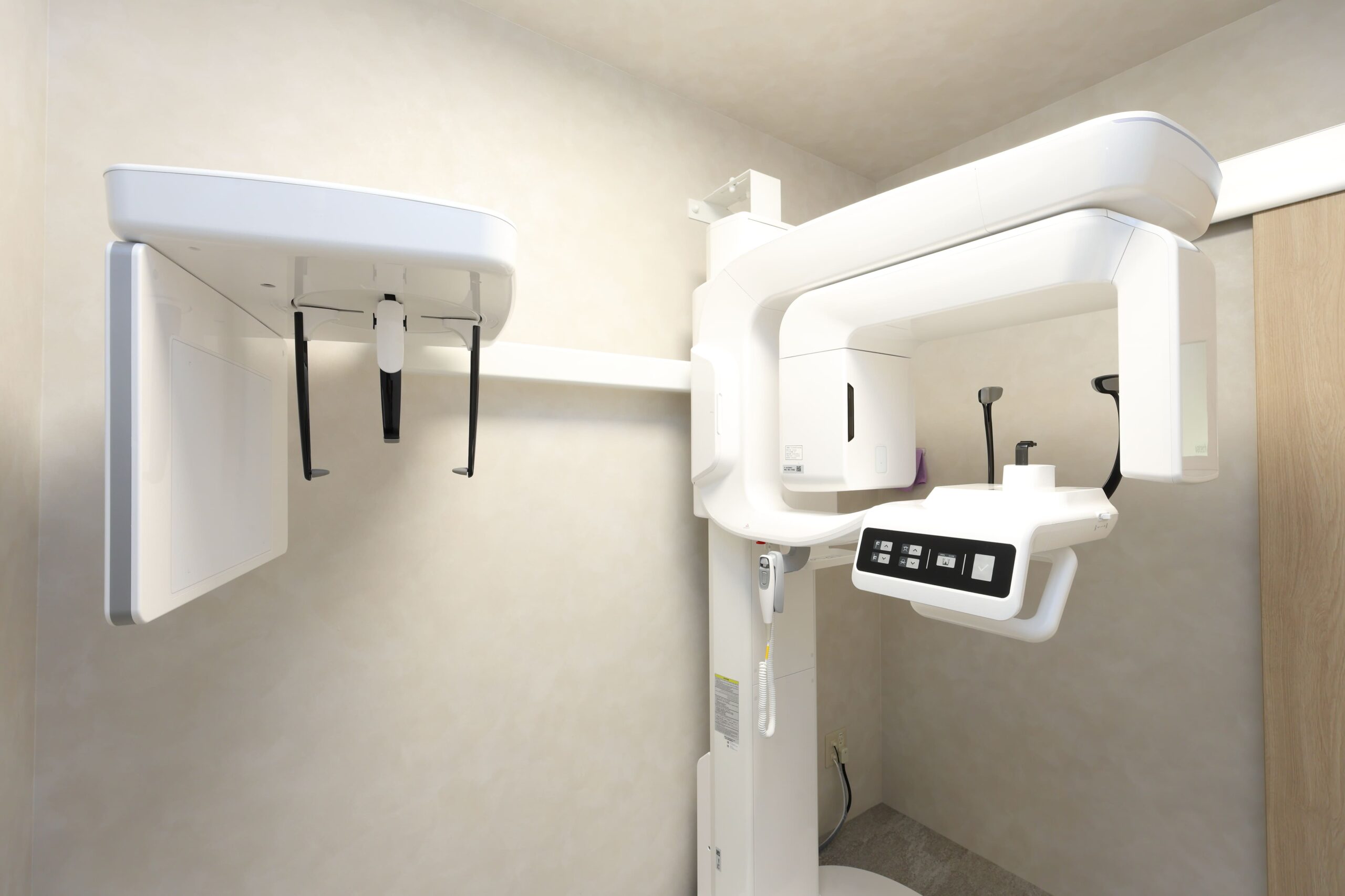 治療を始める前に、まず歯の状態を詳しく確認するための検査を行います。当院では、歯や顎の骨の状態、神経や血管の位置まで立体的に把握できる「歯科用CT」を使用しています。これにより、通常のレントゲンでは見えにくい根の形状や病巣の広がりまで把握でき、より精密な診断が可能になります。
